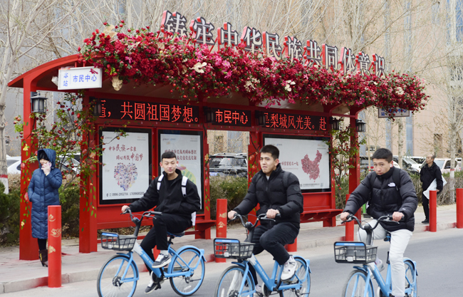 新年来临之际,库尔勒市将主城区8座公交站台装扮一新,迎接新年的到来。亮丽的公交站台成了梨城一道独特的风景,吸引众多市民前往拍照留影。(记者 陈剑飞 摄)