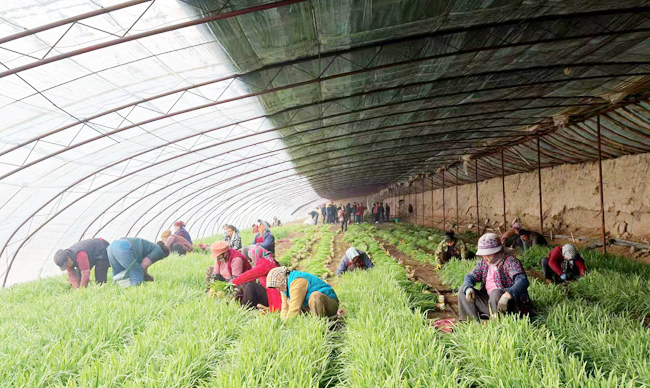 稳定的市场需求不仅保障了村民收入,还带动了本村及周边劳动力就业。大棚内,村民们分工协作,收割、分拣、捆扎、装车,一派繁忙景象。