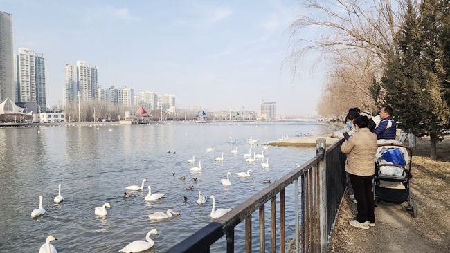 1月12日,在杜鹃河风帆雕塑附近水域,数百只天鹅、野鸭、银鸥等野生水鸟聚集在未封冻的河面上,不少市民与游客驻足欣赏、拍照留念。