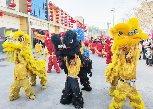 库尔勒市第十小学少儿舞龙舞狮队惊艳亮相梨城美食街新春社火巡游。(记者 杨柳青 摄)