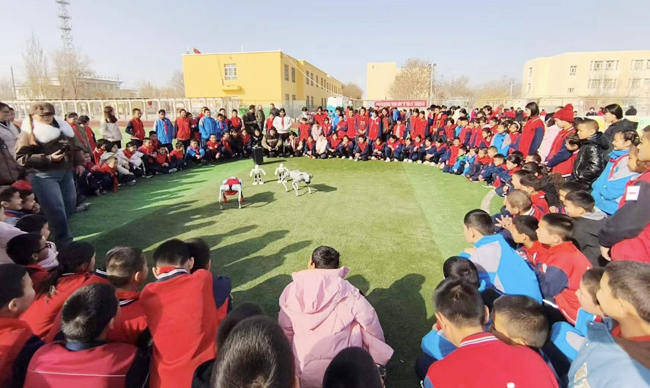 在尉犁县第二小学,新疆科普活动中心的老师带来机器狗展演与机器人互动教学。(通讯员 李春燕 摄)