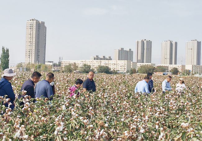 专家组来到巴州各棉花生产试验品种(系)试验田,对早中熟陆地棉、长绒棉,早中熟抗虫棉共14个生产试验品种(系)开展田间实地鉴评。