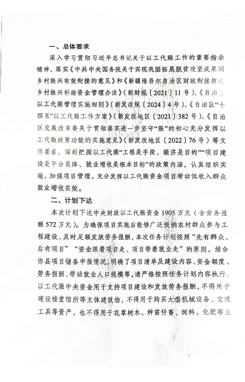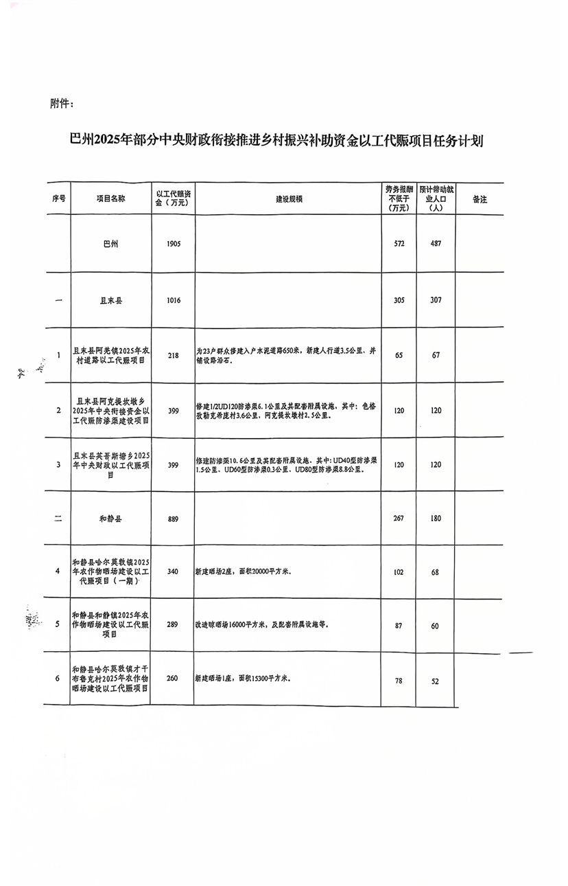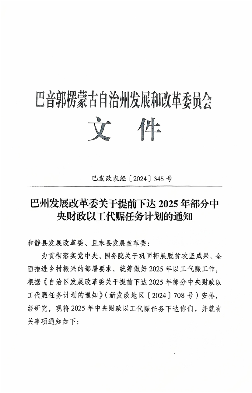 巴州发展改革委关于提前下达2025年部分中央财政以工代赈任务计划的通知