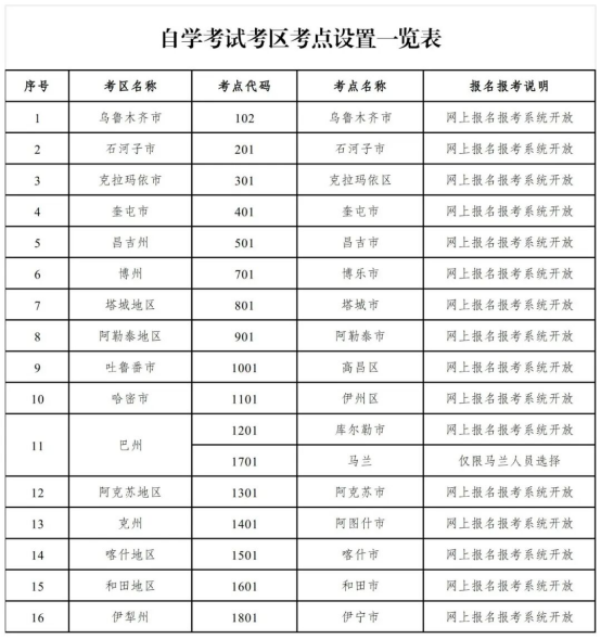 根据《高等教育自学考试考务工作规定》,自学考试考点设置在地级人民政府(行政公署)所在地(附表1)。考生可根据考点所在考区自行选择报考,具体考点以考生《准考证》信息为准。