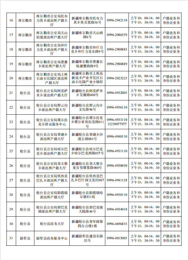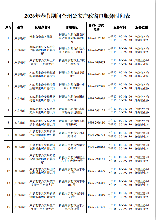 为切实满足春节期间广大群众(特别是返乡群众、外出务工人员、学生)办理户籍、居民身份证等业务需求,进一步提升公安政务服务水平,巴州公安机关户籍窗口春节期间推出以下便民服务措施,现将有关事宜通告如下:
