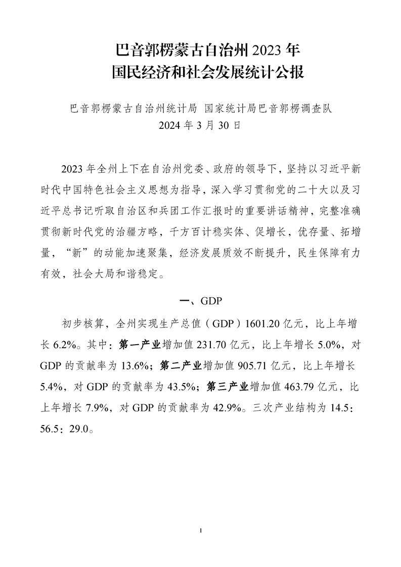 巴音郭楞蒙古自治州2023年国民经济和社会发展统计公报.pdf