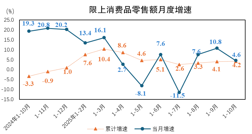 1-10月,巴州实现限额以上社会消费品零售总额111.01亿元,同比增长4.2%,增速较1-9月提高0.1个百分点。